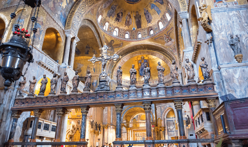 A tour not only to see Venice but also to experience the city through its history and glorious past. Surrounded by the Basilica's beautiful golden mosaics and marble inlays, your guide will take you through the history and peculiarities of this unique masterpiece of Byzantine art. Among the beauties inside the Basilica, you will have the opportunity to admire the Pala d'Oro, a fine example of Byzantine art with gems and precious stones.